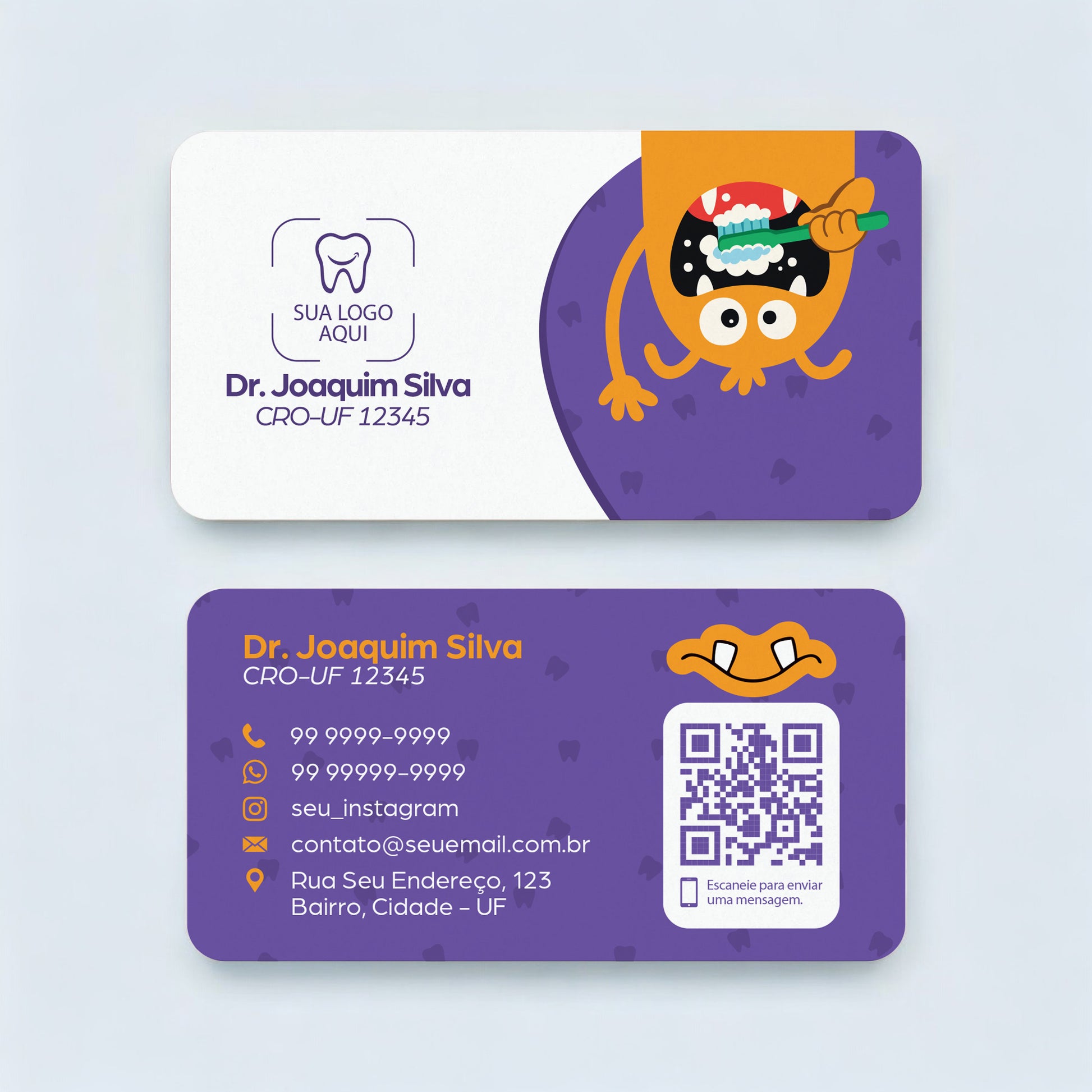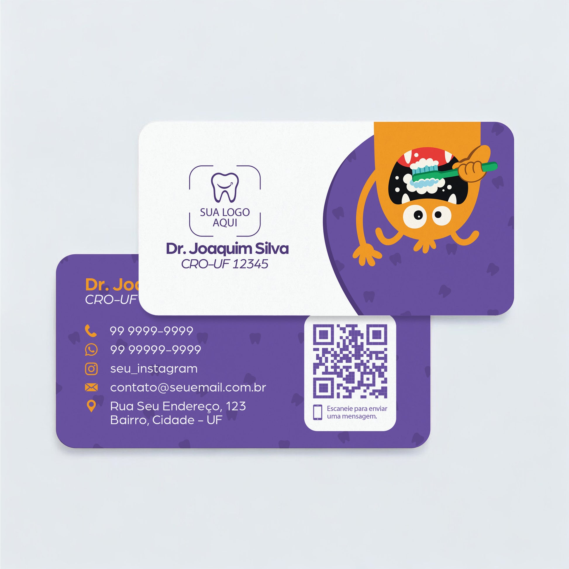 Cartão de Visita Odontológico com os quatro cantos arredondados, totalmente personalizável, produzido em papel couché 300g, com 8,5 cm de largura por 4,4 cm de altura, colorido frente e verso.