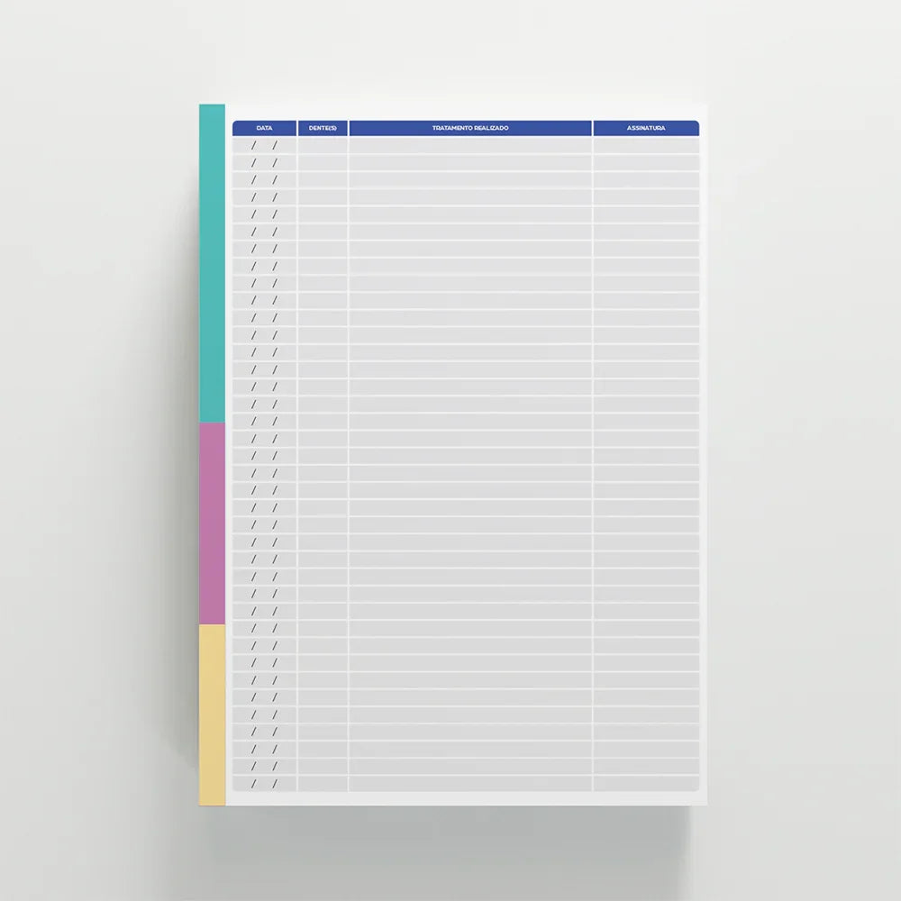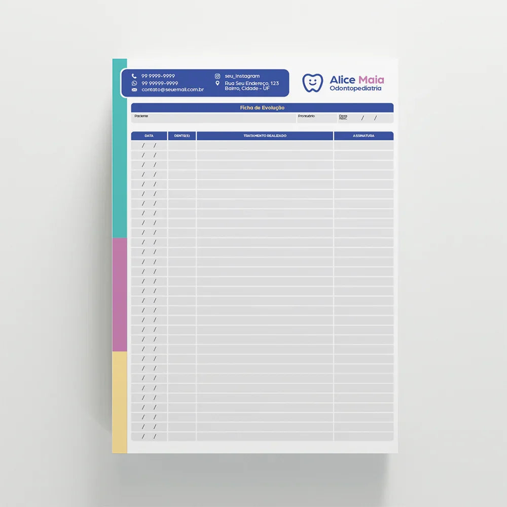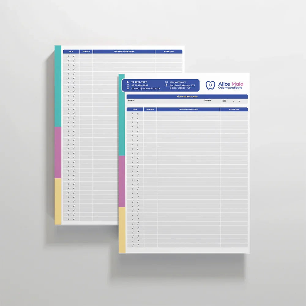 A Ficha de Evolução é essencial para o acompanhamento contínuo e seguro do tratamento odontológico. Com ela, o profissional registra de forma clara e organizada cada atendimento, garantindo um histórico completo do paciente. Nosso modelo é desenvolvido conforme as diretrizes do CFO, proporcionando mais credibilidade, organização e respaldo ético na prática clínica. Possui dimensões A4 (21 x 30cm), papel Offset 90g e impressão colorida 4x4, cada bloco contém 100 folhas blocadas com cola para facilidade de uso.