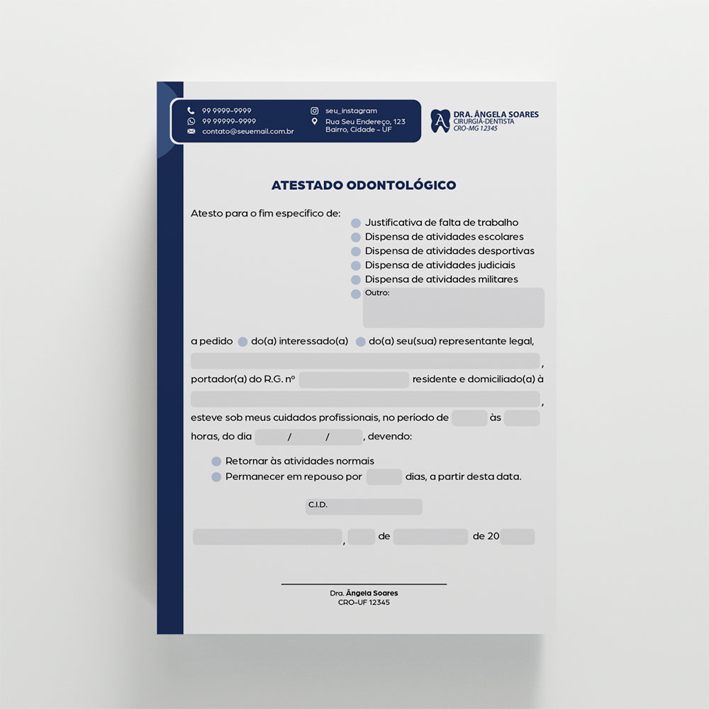 Nosso material segue as diretrizes estabelecidas pelo Conselho Federal de Odontologia (CFO) e fica sob a responsabilidade do cirurgião-dentista. Destacamos que o atestado odontológico é valido apenas se constar carimbo e assinatura do profissional. Ou seja, não pode ser assinado pela secretária, auxiliar de saúde bucal – ASB, técnico em saúde bucal – TSB ou qualquer outro membro da equipe odontológica. Estamos comprometidos em fornecer produtos que atendam aos mais recentes regulamentos, garantindo práticas odontológicas seguras e éticas.