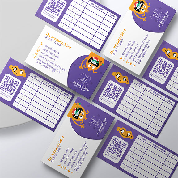 Cartão de Retorno Odontológico é ideal para o agendamento e o comparecimento às próximas consultas. Criado para tornar o acompanhamento do tratamento mais eficiente, esse cartão é uma ferramenta simples, mas essencial para manter a comunicação clara entre o consultório e o paciente. Possui formato retangular, totalmente personalizável, produzido em papel couché 300g, com 8,7 cm de largura por 4,7 cm de altura, colorido frente e verso.