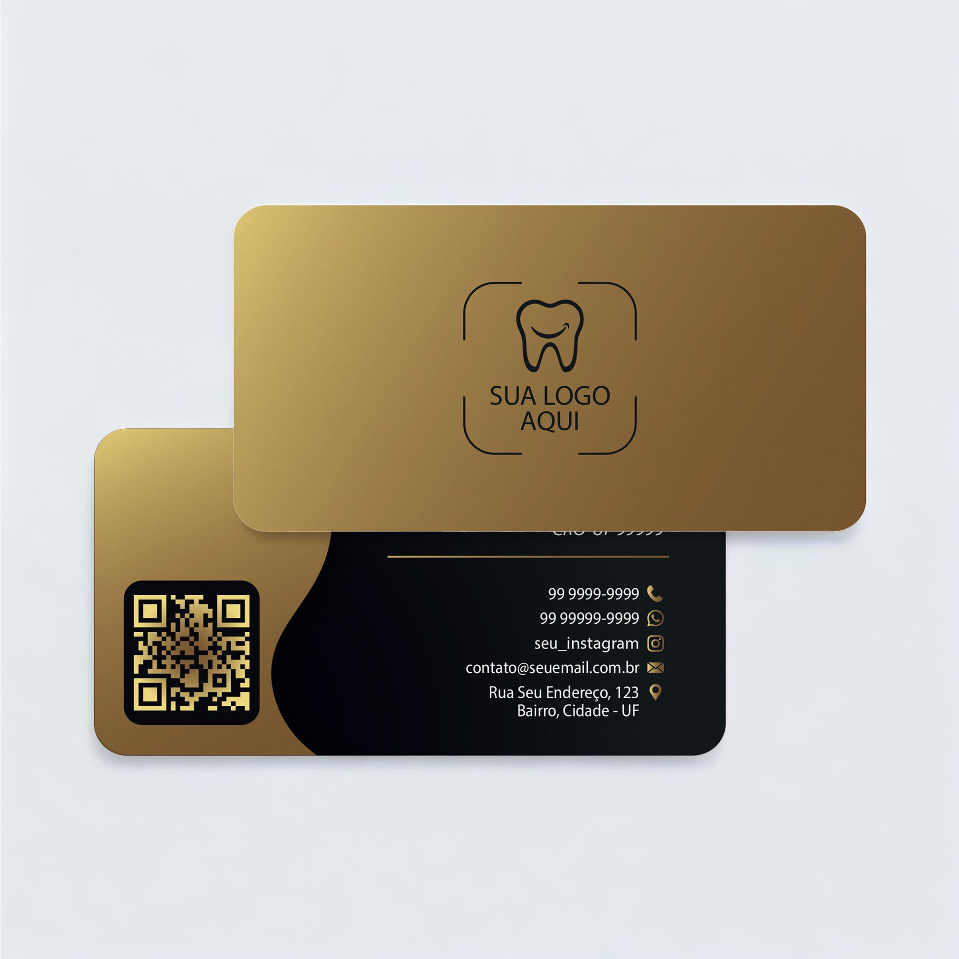 Cartão de Visita Odontológico com os quatro cantos arredondados, totalmente personalizável, produzido em papel couché 300g, com 8,5 cm de largura por 4,4 cm de altura, colorido frente e verso.