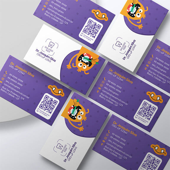 Cartão de Visita Odontológico com formato retangular, totalmente personalizável, produzido em papel couché 300g, com 8,7 cm de largura por 4,7 cm de altura, colorido frente e verso.