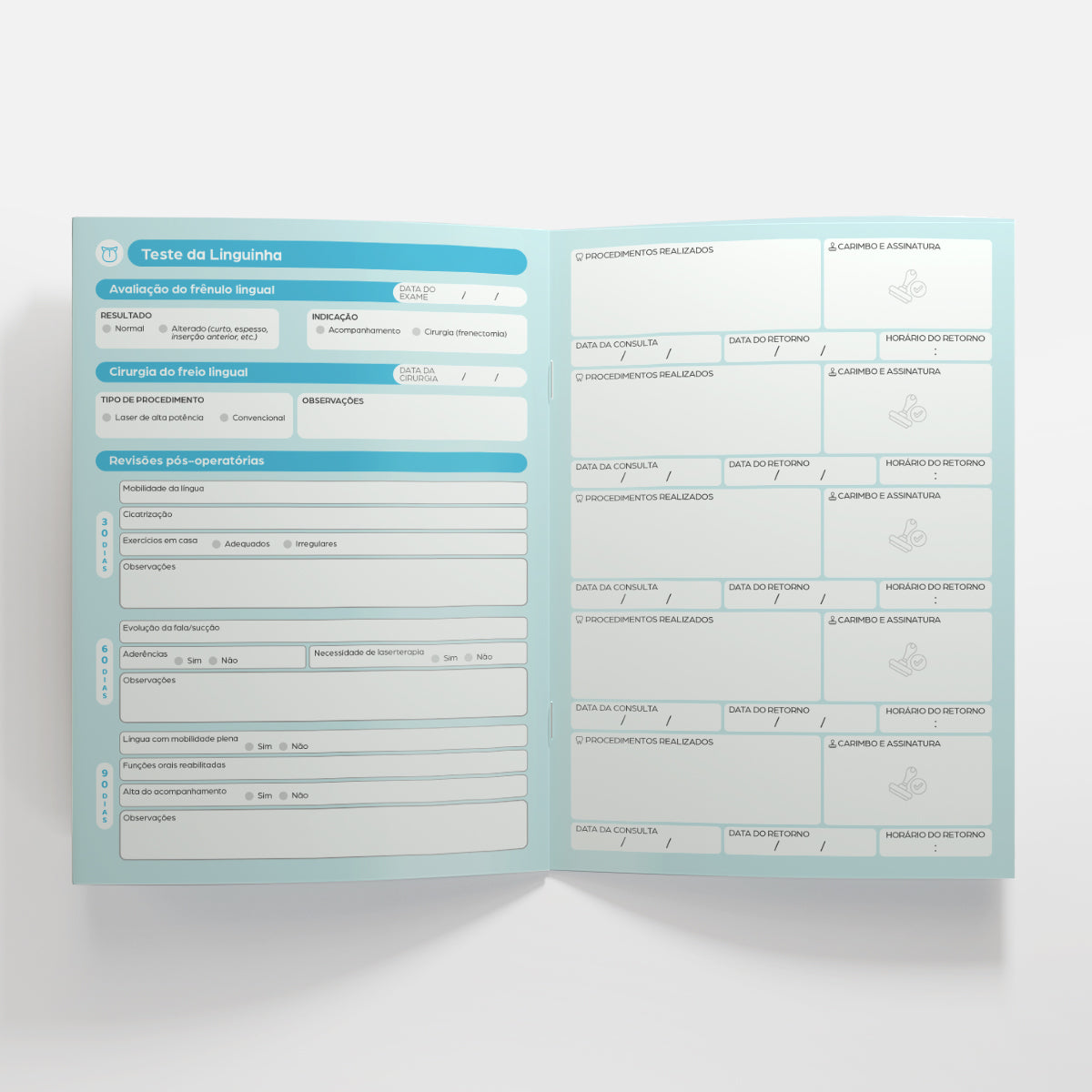 Com um design lúdico e totalmente personalizável, ela ajuda a registrar consultas, procedimentos, orientações e a evolução do tratamento, fortalecendo o vínculo com os pais e incentivando o cuidado contínuo com a saúde bucal da criança.
