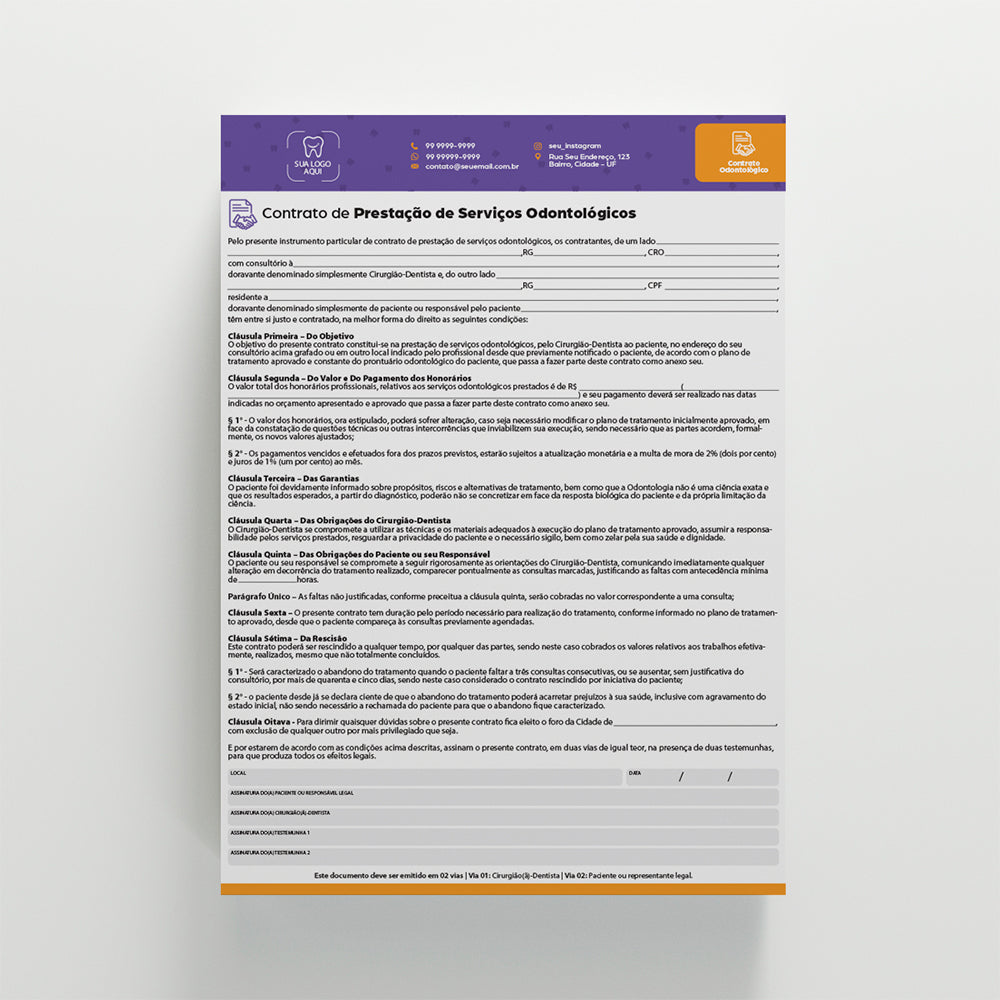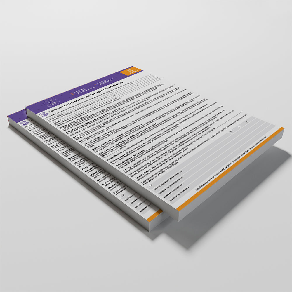 O Contrato de Prestação de Serviço é um documento formal utilizado por cirurgiões-dentistas para detalhar de forma clara e objetiva os procedimentos que serão realizados, as condições de execução, os prazos estimados, os custos envolvidos e demais informações relevantes ao atendimento do paciente. Esse instrumento tem como principal finalidade garantir a transparência na relação profissional-paciente, promovendo segurança jurídica para ambas as partes. Possui dimensões A5 (15 x 21 cm), papel Offset 90g e impressão colorida 4x0, cada bloco contém 100 folhas blocadas com cola para facilidade de uso.