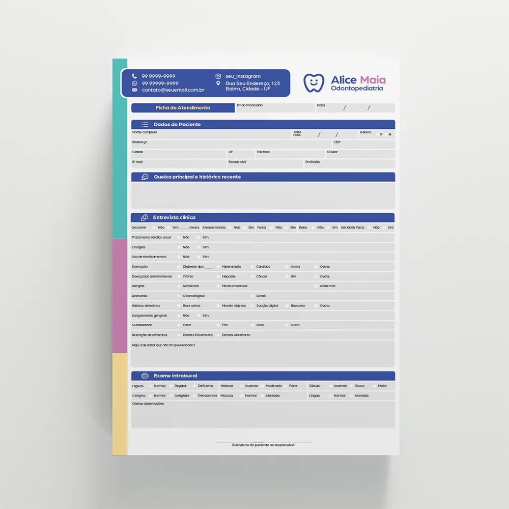 Essencial para o atendimento seguro e completo dos pacientes, a ficha clínica organiza todas as informações relevantes sobre histórico de saúde, anamnese, tratamentos realizados e dados pessoais. Um material indispensável para garantir responsabilidade, organização e um acompanhamento eficaz em cada consulta. Possui dimensões A4 (21 x 30cm), papel Offset 90g e impressão colorida 4x4, cada bloco contém 100 folhas blocadas com cola para facilidade de uso.