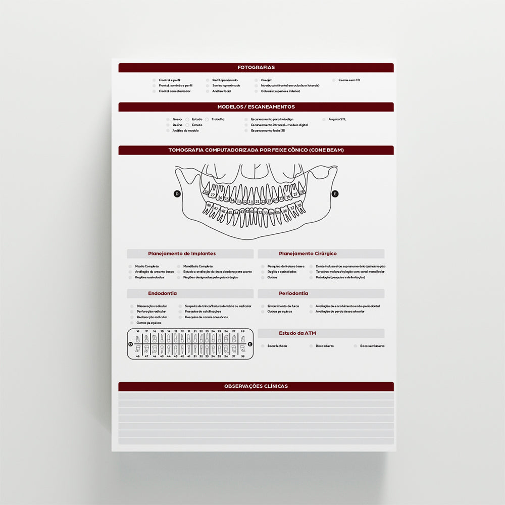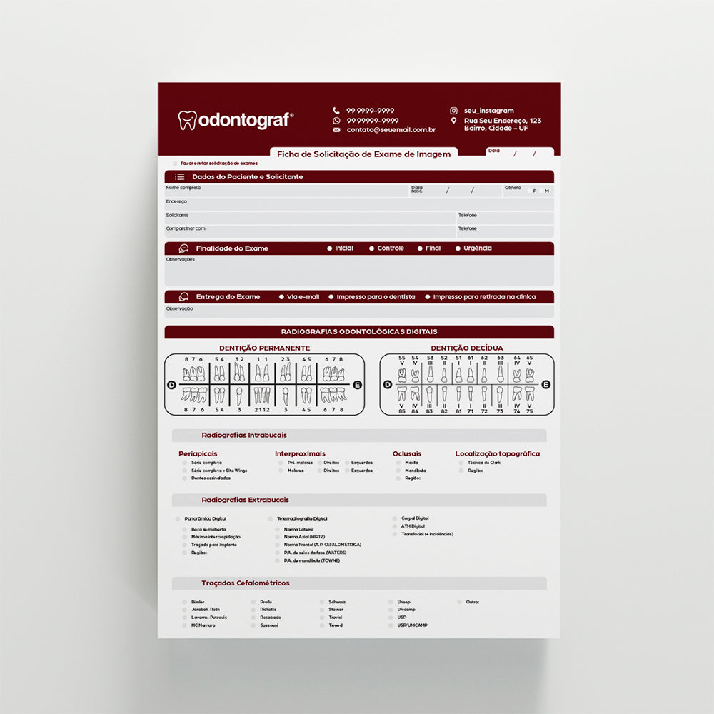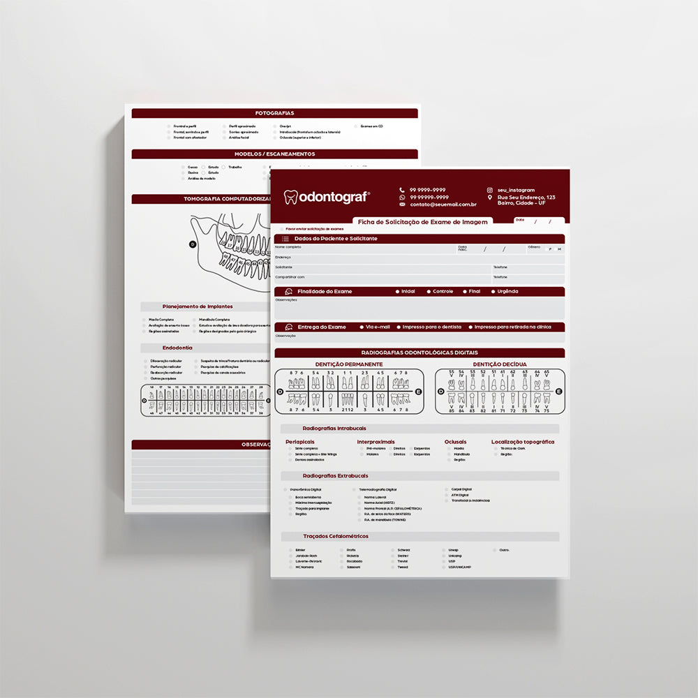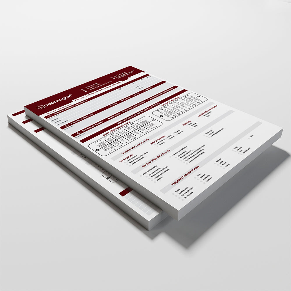 A Ficha Radiográfica Odontológica da OdontoGraf foi desenvolvida para auxiliar cirurgiões-dentistas a registrarem, anexarem e acompanharem imagens radiográficas dos pacientes de forma clara, segura e padronizada. Possui dimensões A4 (21 x 30cm), papel Offset 90g e impressão colorida 4x4, cada bloco contém 100 folhas blocadas com cola para facilidade de uso.