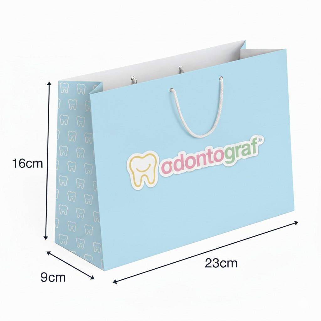 A Sacola Horizontal de Papel com Fundo Colorido é a escolha ideal para valorizar a entrega de materiais odontológicos, brindes e kits especiais, transmitindo cuidado, organização e profissionalismo desde o primeiro contato com o paciente.